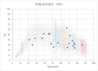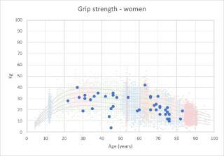 Over 60 delegates took part and were able to see how their grip strength compared to people of a similar age, both in the general population and in other delegates. The graphs below (Figure 1) illustrate the results; the blue dots represent the delegates who had their grip strength measured at the event, and their measures are compared against published norms.