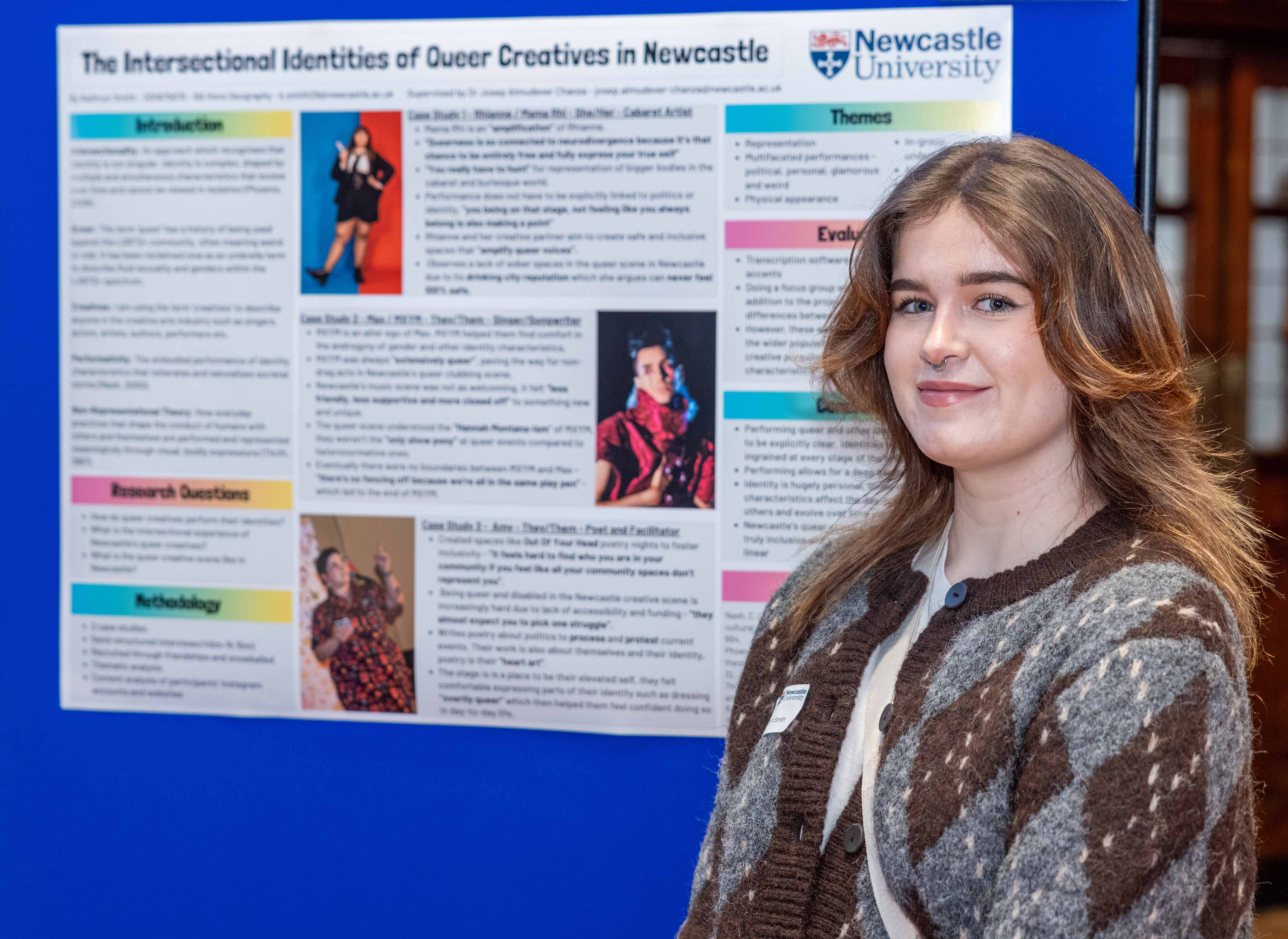 The aim was to explore how queer creatives in Newcastle perform and express elements of their identity, their queer intersectional experience, and what the queer creative scene feels like in Newcastle. Case study interviews of a singer/songwriter, a poet and facilitator, and a cabaret artist were used to explore these questions.